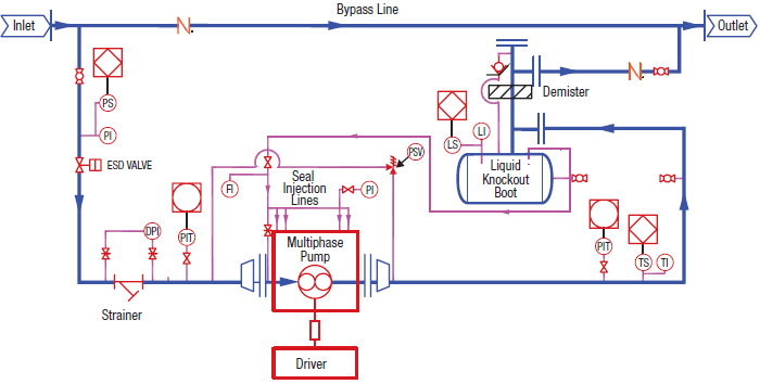 Discharge piping with liquid knock-out boot (including demister), check valve, manual isolation valve and full flow relief valve (piped to suction)