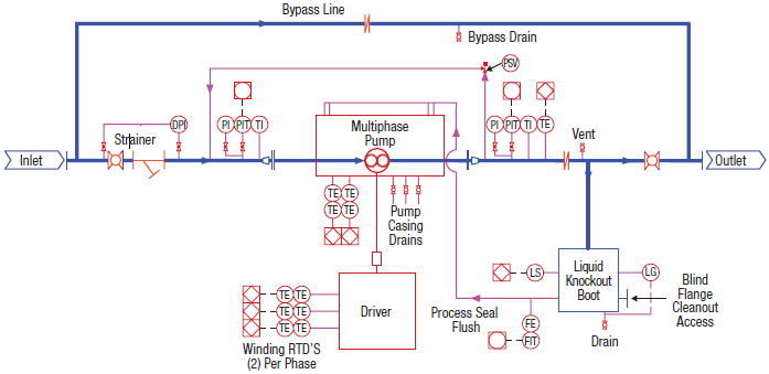 Discharge piping with liquid knock-out boot,check valve, manual isolation valve and full flow relief valve (piped to suction)